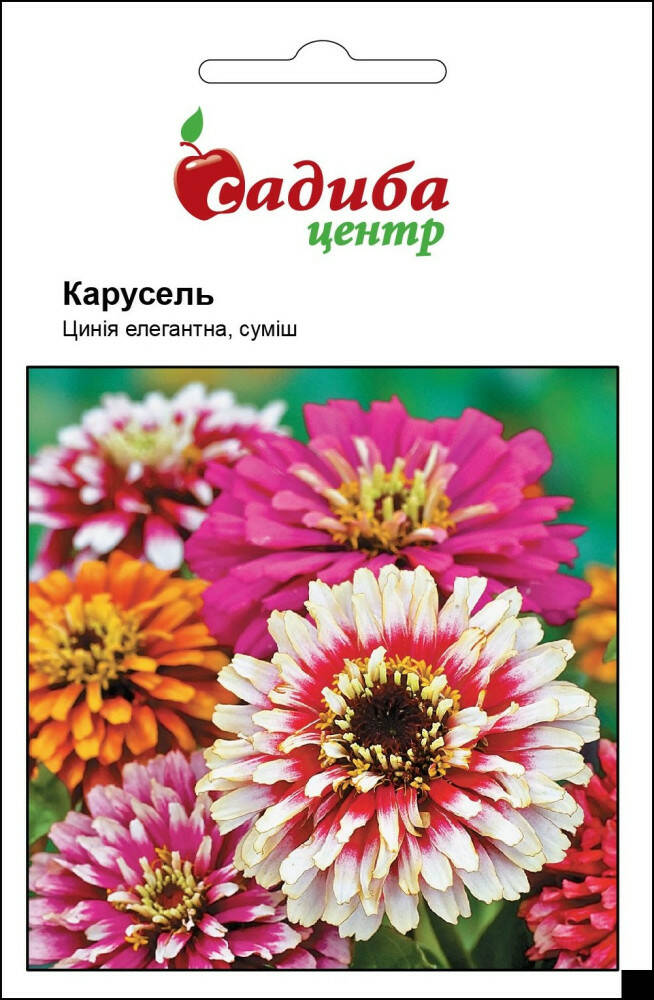 Цинія Карусель - однорічна швидкоростуча рослина висотою 50 см. Суцвіття великі, 7-10 см в діаметрі, з білими краями. Насіння висівають у парники в квітні. Сходи з'являються на 4 - 6 день. Пікірують один раз. На постійне місце висаджують на відстані 20 - 35 см. Можна висівати безпосередньо на постійне місце наприкінці квітня - початку травня. Цвіте рясно і тривало, з середини червня до морозів. Теплолюбна, найкраще росте на відкритих сонячних місцях, родючих ґрунтах і при рясному поливі. Вирощують на клумбах, рабатках, в групових посадках і для зрізу.