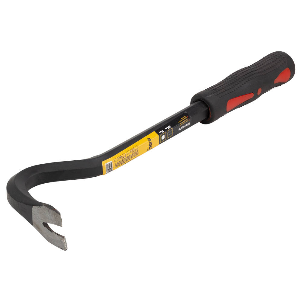 Цвяходер двокомпонентна рукоятка 300x14мм Sigma (4324421) застосовується для видалення цвяхів, будівельних скоб, демонтажу будівельних матеріалів, віконних і дверних прорізів і інших видів робіт. Шестигранний профіль брухту виготовлений з високоякісної кованої сталі, що пройшла загартування. Двокомпонентна ручка сприяє більш комфортній роботі. Покритий порошковою фарбою, що забезпечує антикорозійну дію.