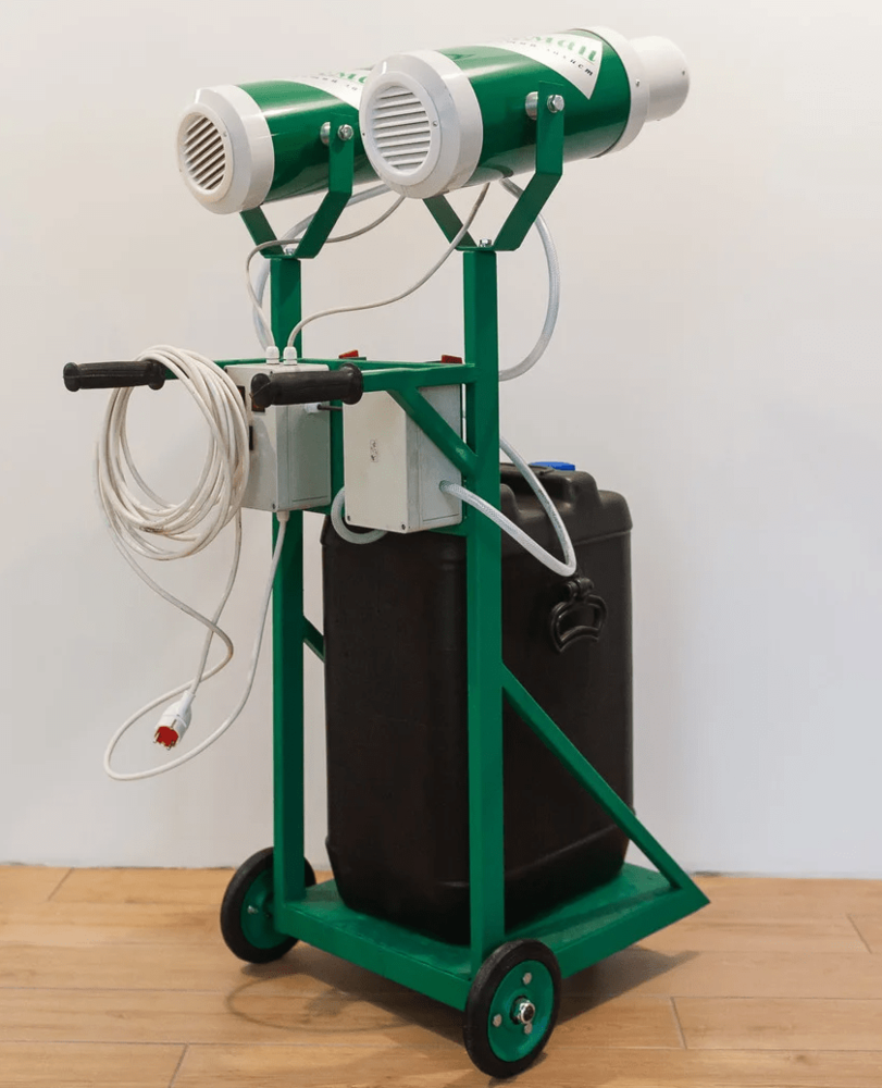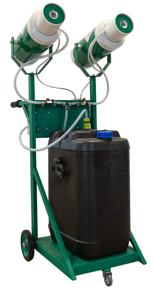 Туманоутворювач даного типу - двотурбінний потужний агрегат з функцією підтримки необхідного рівня вологості. Відмінно зарекомендував себе при використанні на великих площах. Перевагою апарату є можливість його використання у двох режимах: