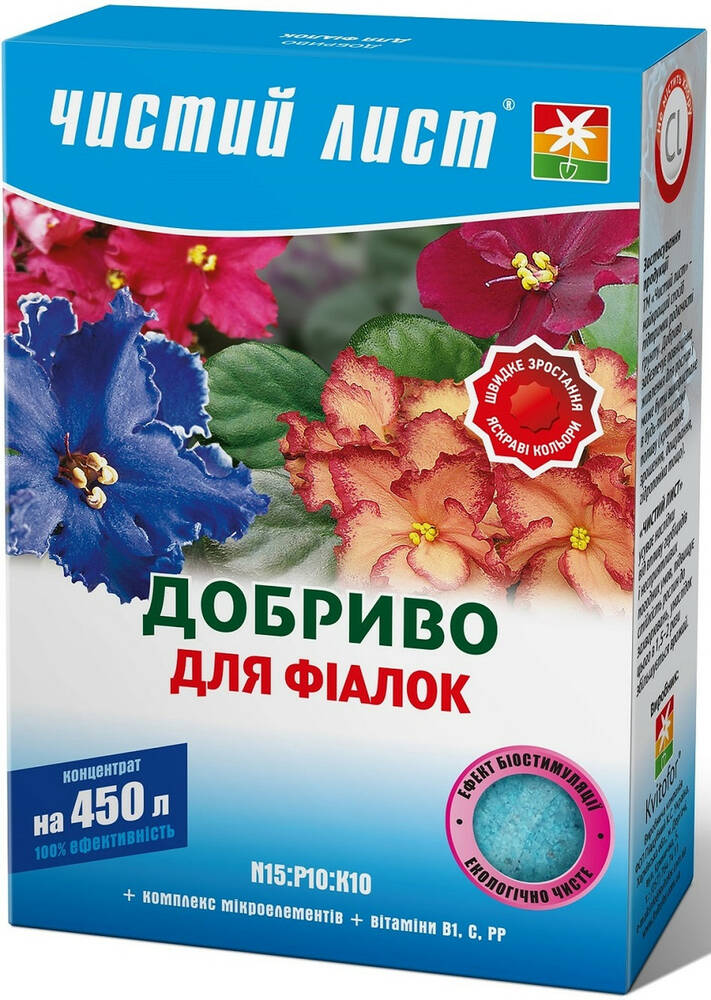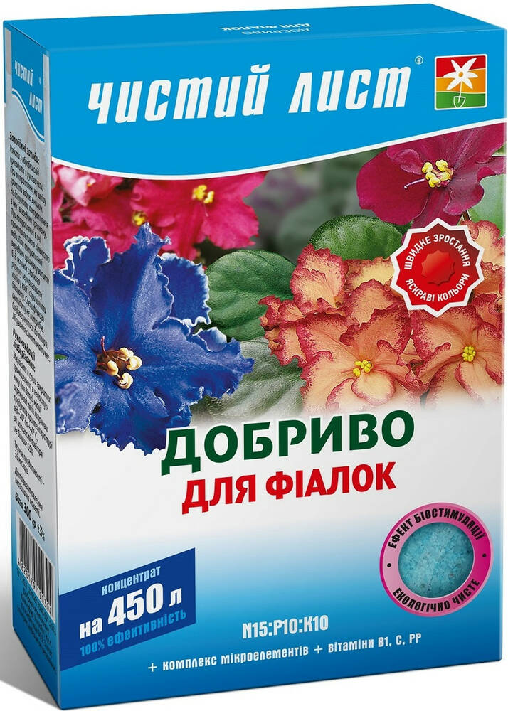 Удобрение Чистый лист для фиалок - лучший способ поддержать плодородие почвы. Удобрение обеспечивает полноценное питание для растений и может быть использовано в любой системе полива (капельное орошение, дождевание, гидропоника и т.д.). Чистый лист устраняет последствия от воздействия гербицидов и неблагоприятных погодных условий, повышает устойчивость растений к заболеваниям, вследствие этого в 1,5-2 раза увеличивается урожай.