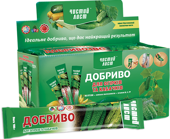 Удобрение Чистый лист для огурцов и кабачков - лучший способ поддержать плодородие почвы. Удобрение обеспечивает полноценное питание для растений и может быть использовано в любой системе полива (капельное орошение, дождевание, гидропоника и т.д.). Чистый лист устраняет последствия от воздействия гербицидов и неблагоприятных погодных условий, повышает устойчивость растений к заболеваниям, вследствие этого в 1,5-2 раза увеличивается урожай.
