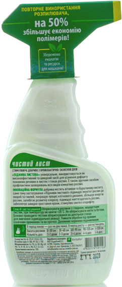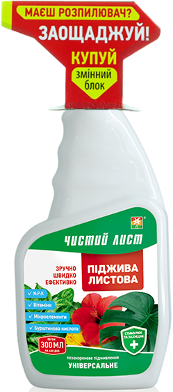 Удобрение Чистый лист Подкормка листовая универсальная - Используется как высокоэффективное и быстрое средство для устранения дефицита питательных веществ листьях и ветвях растений. Является также удобным средством профилактики заболеваний всех комнатных растений.