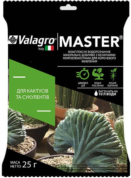 Удобрение MASTER 13.40.13 для кактусов и суккулентов - Сбалансированное соотношение макро- и микроэлементов удобрения Master удовлетворяет все потребности в питании кактусов и суккулентов, агава, алоэ, эпифилума, красавицы, кавортии и др. Удобрение Master полностью растворимо в воде, что значительно улучшает усвоение его растениями и способствует формированию плотных кожистых покровов, своевременному вызреванию побегов, стимулирует и продлевает срок цветения. Благодаря хелатной форме удобрение идеально подходит для корневого питания. При применении удобрения Master растения становятся более устойчивыми к болезням и вредителям.