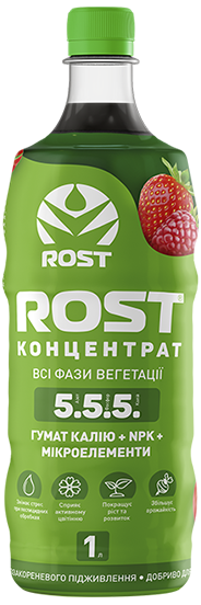 ROST Концентрат - концентрированное органо-минеральное удобрение на основе гумата калия, содержащее комплекс макро- и микроэлементов. Удобрение обеспечивает растения необходимыми элементами питания; мобилизует иммунную систему растений; улучшает синтез сахаров, аминокислот, витаминов в растении; усиливает поглощение воды и кислорода, что в результате ускоряет деление клеток; интенсифицирует обменные процессы; повышает поступление питательных элементов в растение; ускоряет синтез нуклеиновых кислот и белка; активирует белковый и углеводный обмен веществ; увеличивает проницаемость клеточной мембраны; облегчает транспортировку питательных веществ внутрь клетки.