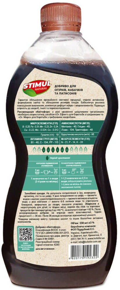 Удобрение STIMUL NATURAL для огурцов, кабачков и патиссонов - органическое удобрение для увеличения урожайности овощной продукции, способствует активному формированию завязи и увеличению размеров плодов. Обеспечивает растения полноценным питанием, компенсирует дефицит макро- и микроэлементов. Повышает сопротивляемость к болезням, гнили и переохлаждению.