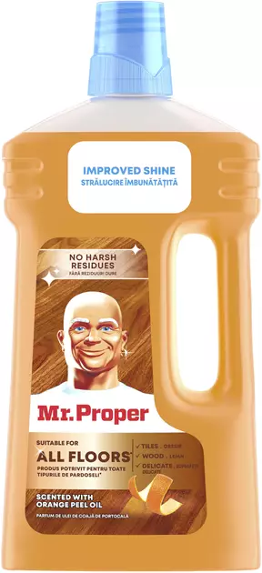 Мийна рідина для дерев’яної підлоги Mr. Proper Delicate & Clean дає змогу досягти дивовижної чистоти. Продукт безпечно використовувати на дерев’яних підлогах, до того ж він підходить для всіх видів підлоги й поверхонь на кухні та у ванній кімнаті, а також для використання на більшості інших поверхонь у домі. Mr. Proper Wood містить олію апельсинової цедри та ефективно видаляє пил, жир та бруд, результати перевірки засобу на найпоширеніших видах поверхонь і типах забруднень демонструють повне усунення бруду та плям. Не залишає розводів. Просто розчиніть два ковпачки мийної рідини Mr. Proper Wood у 5 літрах теплої води та використовуйте розчин для миття підлоги. Ваша підлога буде чистою без плям і розводів. Не потрібно змивати. Повну інструкцію із застосування див. на упаковці.