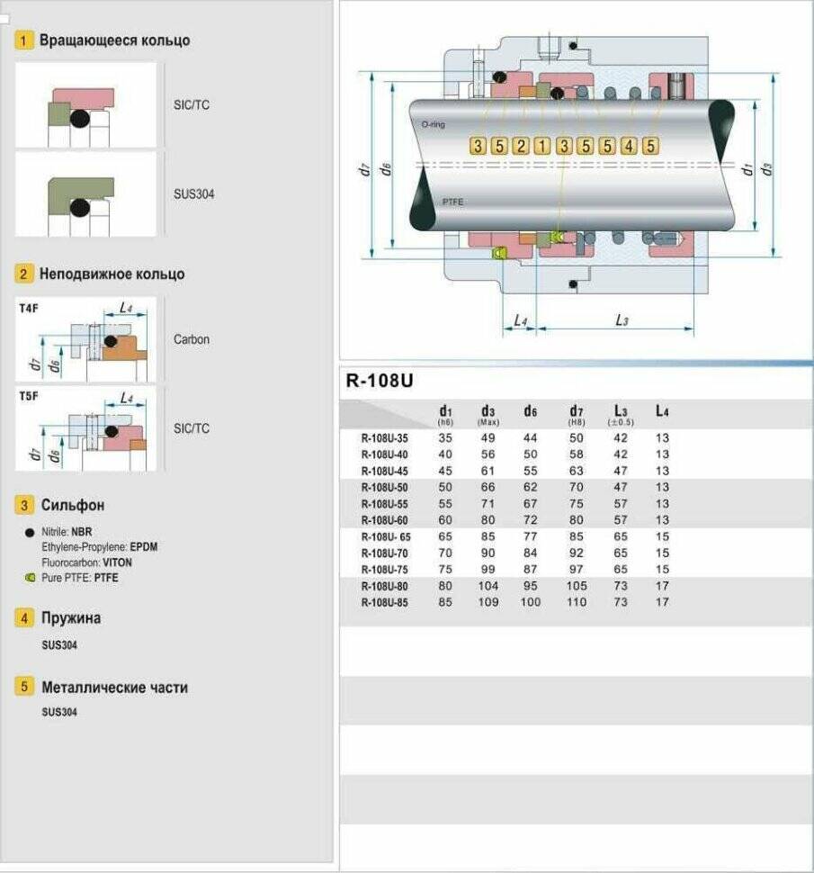 Торцеве ущільнення R-108U використовується при температурах від-40 до + 220°С, з тиском до 0,6 МПа і швидкістю обертання до 15 м/сек. Використовують в хімічних насосах для перекачування агресивних рідин , можливе виконання ущільнюючих елементів з PTFE.