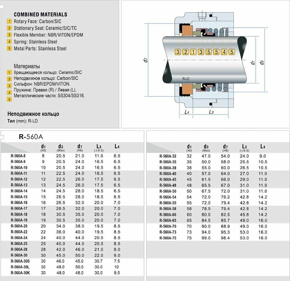 Механічне торцеве ущільнення валу R-560A - це одинарне ущільнення, яке використовується при температурах від -20 до + 150°С, з тиском до 1,8 МПа і швидкістю обертання до 13 м/с.