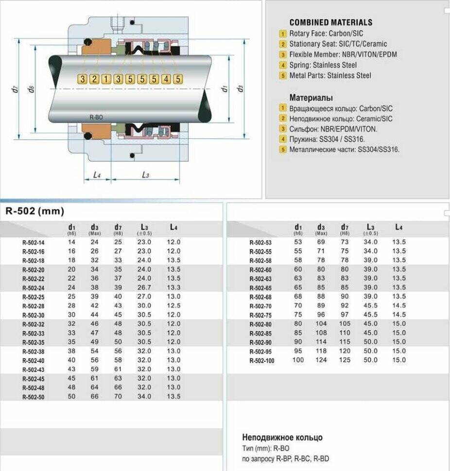 Механічне торцеве ущільнення R-502B - це одинарне, незалежне від напрямку обертання валу ущільнення, яке використовується при температурах від -40 до + 200°С, з тиском до 2,8 МПа і швидкістю обертання до 13 м/с.