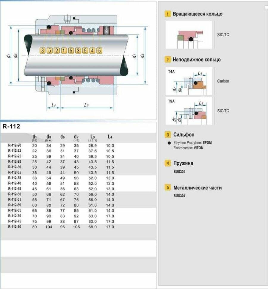Механічне торцеве ущільнення R-112 використовується при температурах від -40 до + 180°С, з тиском до 1 МПа і швидкістю обертання до 10 м/сек.