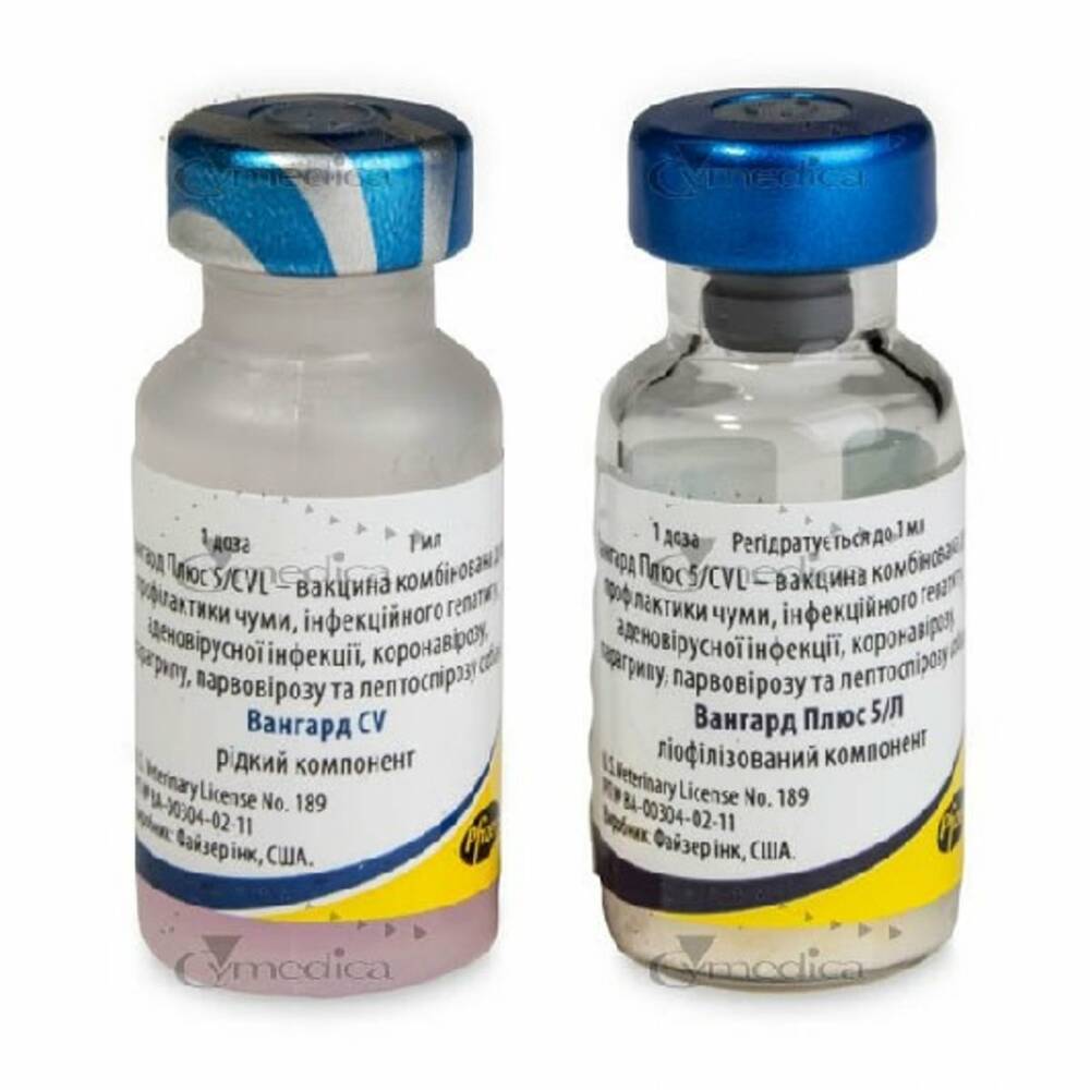 Вангарда ® Плюс 5 / CV-L є ліофілізованим препаратом аттенуірованних штамів вірусу СD (собача чума), CAV-2 (собачий аденовірус), вірусу CPI (собачий парагрип), та інактивованих цільних культур L.canicola і L. icterohaemorrhagiae, плюс рідкого инактивированного CCV (собачий коронавірус) з ад'ювантом. Фракція CPV є насиченою (107,0 TCID50 / доза) і була аттенуированного, використовуючи низьке число пересівань (35 пересівань собачого ізоляту з максимум 2 можливими додатковими пересіву для виробництва) в клітинній лінії собак, що дає йому імуногенні властивості, здатні переважити інтерференцію материнського антитіла на рівнях. клітинних лініях. Рідкий компонент використовується для регідратірованія ліофилізованого компонента, який упакований за допомогою інертного газу замість вакууму.