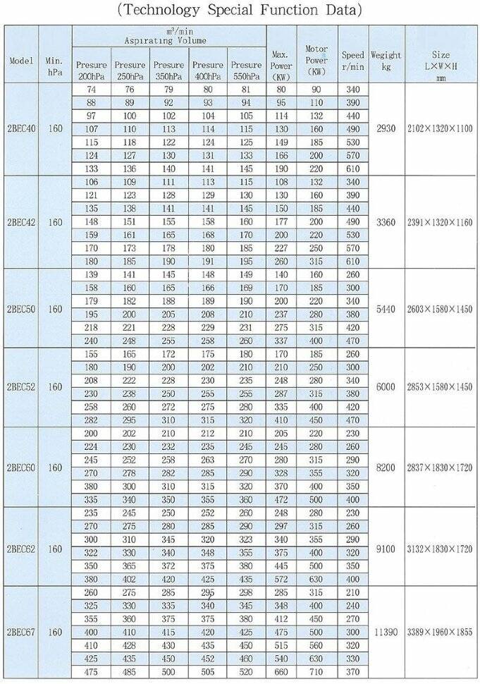 Водокільцевий вакуум-насос серії 2BEC використовується для всмоктування повітря або інших агресивних, нерозчинних у воді газів, що не містять твердих зерен, для створення вакууму в герметичних посудинах. У всмоктуваному газі може бути дозволено містити невелику кількість рідини. Рекомендований діапазон тиску роботи насоса: 0,04 МПа - 0,09 МПа. Такі насоси використовуються в основному в хімічній, нафтохімічній галузях, у легкій промисловості, фармацевтиці, паперовій промисловості, у галузях металургії, будівельних матеріалів, електроприладів, продуктів харчування, збагачення вугілля, збагачення руди, добрив та інших галузях промисловості.
