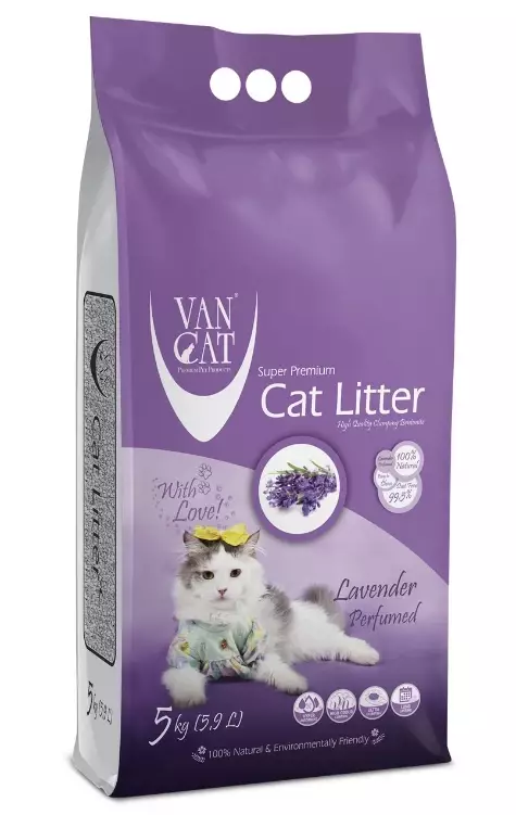 Наповнювач Van Cat Super Premium Quality з лавандою виготовляється з натурального білого бентоніту (природний глинистий мінерал), активованого за допомогою кальцинованої соди із застосуванням подвійного просіювання для усунення пилу.