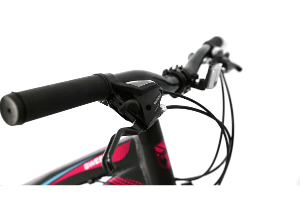Гірський велосипед оснащений перемикачами швидкостей Shimano та подвійним ободом коліс, що робить транспортний засіб міцнішим та стійкішим від пошкоджень під час їзди нерівностями.