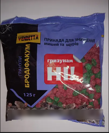 VENDETTA БРОДІФАКУМ - засіб від мишей і щурів, який працює за принципом приманка-яд. Для щурів необхідно розставити приманки по приміщенню, порція 25-50 грамів. Для боротьби з мишами достатньо порцій розміром 10-25 грамів. Загибель гризуна настає через 3-7 діб. Принади встановлюються на відстані 2-15 метрів, залежно від кількості гризунів. Ревізію приманок проводити через 1-2 дні з моменту першої розкладки гранул, після чого ревізію проводити через тиждень. За необхідності процедуру повторити, до повного знищення.