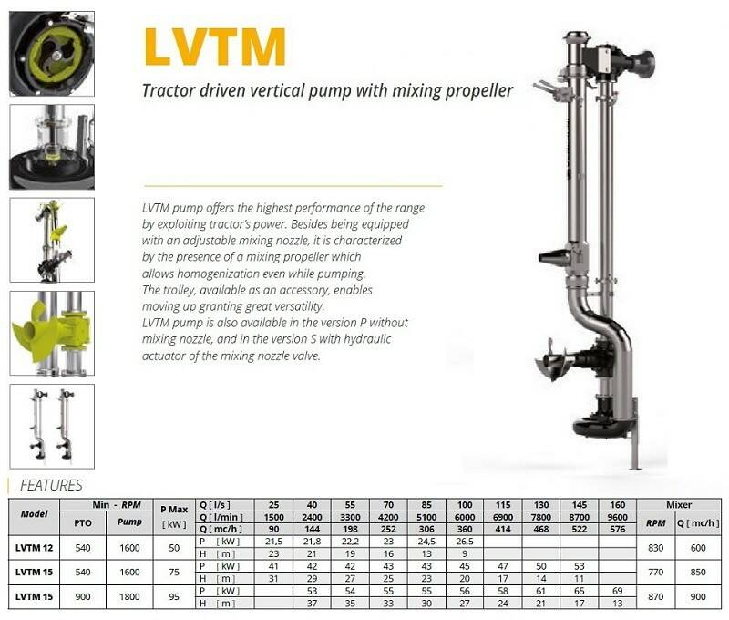Насос LVTM забезпечує найвищу продуктивність в лінійці, використовуючи потужність трактора. Крім того, що він оснащений регульованим змішувальним соплом, він характеризується наявністю змішувального гвинта, який забезпечує гомогенізацію навіть при перекачуванні. Візок, доступний як аксесуар, дозволяє рухатися вгору, забезпечуючи велику універсальність.