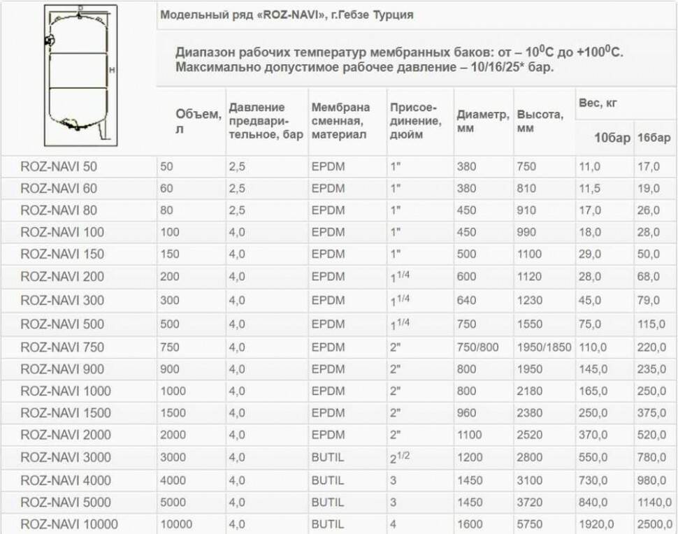 Баки ROZ-NAVI здатні працювати з рідиною, температура якої знаходиться в межах від -10 до + 100°C. Всі моделі ємністю від 100 літрів і вище оснащуються манометром для вимірювання тиску. Баки об'ємом до 2000 л поставляються з мембранами типу EPDM DIN 4807, а від 2000 л