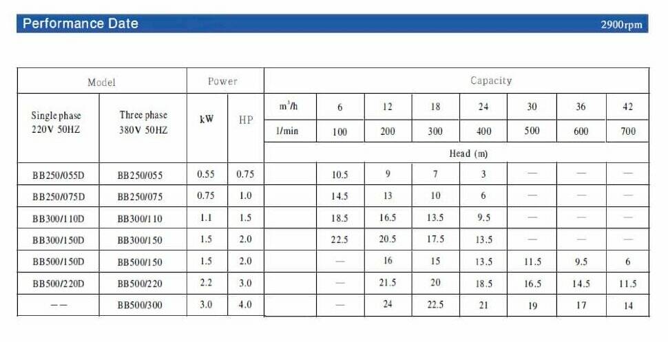 Відцентрові насоси серії BB придатні для перекачування чистої води і слабоагресивних рідин, розчинів гліколю та інших рідин. Насоси можуть застосовуватися в промислових, побутових, мийних, басейнових та іригаційних системах тощо. Цей насос можна використовувати при повному напорі без перевантаження двигуна. Температура рідини:-15°С~+80°С.