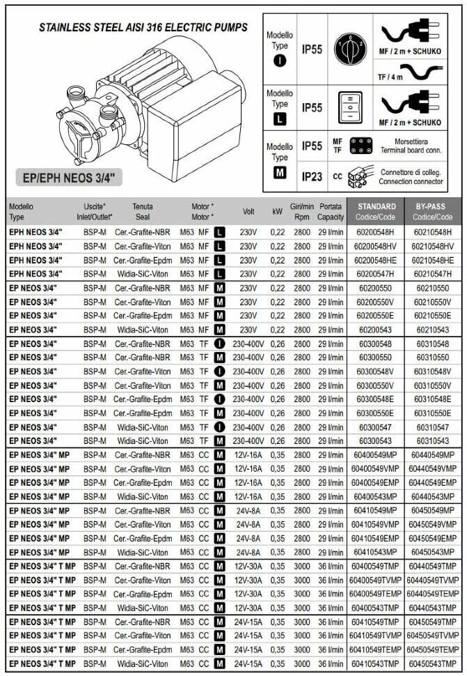 Вихровий насос для перекачування кислот LIVERANI EPH NEOS 3/4, 29 л/хв, MF/L 0,22 кВт, 2800 об/хв, 220B, AISI 316, Seal Cer.-Grafite-NBR