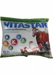 Склад Вітаміни та амінокислоти Фармакологічні властивості Дія препарату зумовлена властивостями окремих компонентів (вітамінів та амінокислот), які сприяють нормалізації обміну речовин в організмі, позитивно впливають на продуктивність, збереженість і відтворні функції сільськогосподарських тварин і птиці. Застосування Препарат застосовують коням, свиням та свійській птиці для поповнення балансу вітамінів та амінокислот; у складі комплексної терапії при анорексії, анемії, виснаженні, стресі; зниженні м'ясної та яєчної продуктивності. Дозування Перорально з питною водою або кормом у дозах: свійська птиця - 0,25-0,5 г препарату на 1 кг корму або 0,125-0,25 г препарату на 1 л води впродовж 4-8 діб; коні, свині - 0,5 г препарату на 1 кг корму або 0,25 г препарату на 1 л води впродовж 3-5 діб. Рекомендується готувати попередній розчин препарату у 10 л води. Приготований розчин використати впродовж 24 год. Протипоказання Не встановлені. Застереження Відсутні. Форма випуску Поліетиленові упаковки по 1, 5, 10, 50, 100, 500, 1000 г. Зберігання Сухе, темне, недоступне для дітей місце при температурі від 5°С до 25°С. Термін придатності - 2 роки з дати виготовлення. Для ветеринарного застосування!