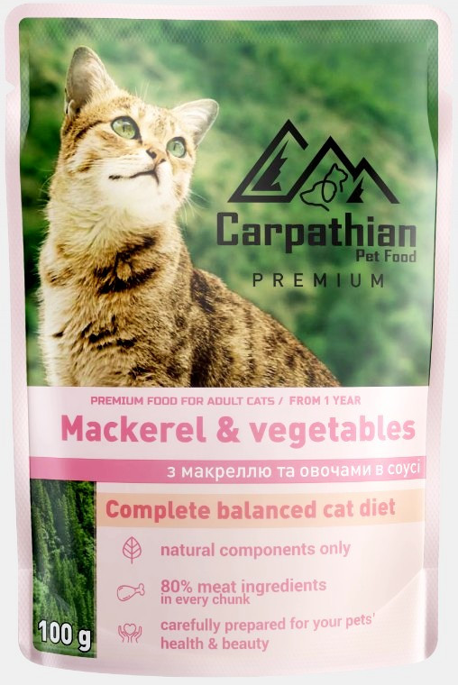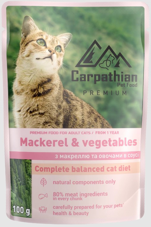 Вологий корм преміум класу від ТМ Carpathian Pet Food «Mackerel&vegetables» з макреллю та овочами в соусі для дорослих кішок безумовно забезпечить нормальну життєдіяльність Вашого улюбленця.