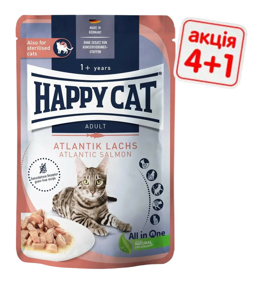 Вологий корм Happy Cat Culinary A-Lachs з лососем для котів (шматочки в соусі) Акція 4+1 (5 х 85 г)