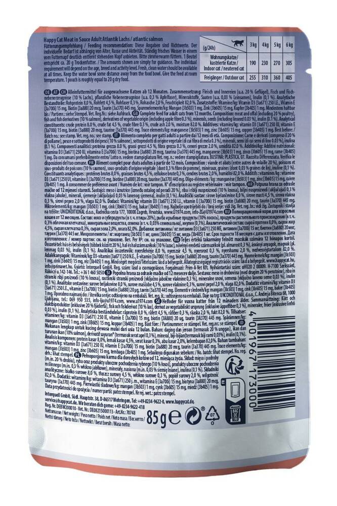 Happy Cat Culinary з атлантичним лососем в соусі - це чисте задоволення з високоякісних інгредієнтів для дорослих кішок у віці від 1 року. Смачний рецепт містить цінні жирні кислоти, підтримує природний блиск шерсті і забезпечує все необхідне для життєдіяльності кішки.