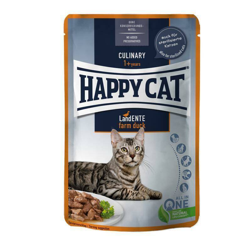 Вологий консервований корм зі шматочками качки Culinary Land-Ente виготовлений європейським брендом Happy Cat для котів старше 12 місяців. В рецептурі корму враховані всі анатомічні особливості дорослих котів, тому рецептура збагачена вітамінами, мінералами та мікроелементами, що дозволяють підтримувати здоров'я тварини, сповнювати її силами та енергією.