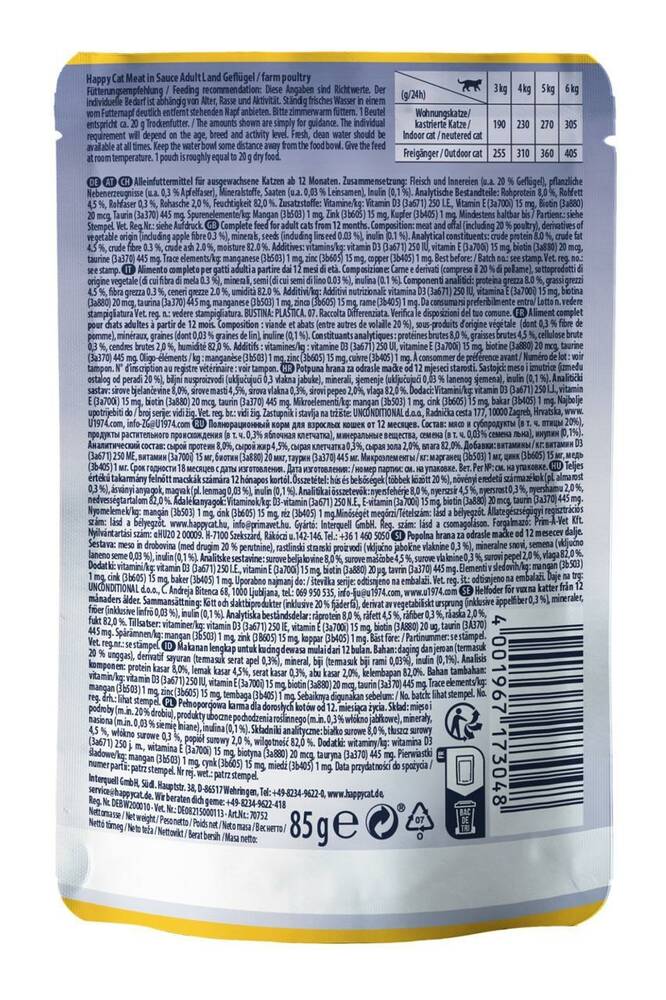 Консервований корм Culinary Land-Geflugel зі шматочками птиці в апетитному соусі, виготовлений німецьким брендом Happy Cat для дорослих, активних кішок. Склад корму ретельно підібраний для забезпечення домашнього вихованця, разом із смачною їжею, усіма необхідними поживними компонентами: вітамінами, мінералами, мікро- та макроелементами.