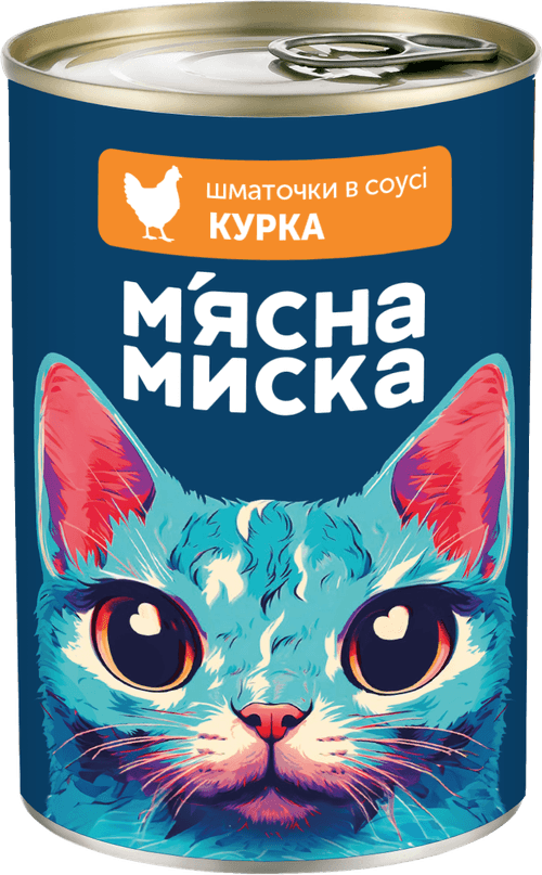 М'ясна миска - щоразу до блиску! М'ясні шматочки з куркою в соусі від М'ясна миска - це новий стандарт корму економ класу. Консерви для кішок М'ясна миска шматочки з куркою у соусі не є делікатесом. Це повнораціонний вологий корм, який готовий до щоденного та постійного годування вашого котика. Смачний та ароматний соус у складі продукту приваблює тваринку до споживання корму. Високий відсоток вмісту м'ясних інгредієнтів (76,5%) дозволяє легко конкурувати з їжею, приготовленою в домашніх умовах або «зі столу», але має стабільну промислову якість спеціалізованого petfood заводу. Консерви М'ясна миска для кішок випускаються в класичних банках зі спеціального харчового металу, завдяки чому корм може зберігатися до 48 годин, за які ви точно згодуєте його своєму улюбленцю.
