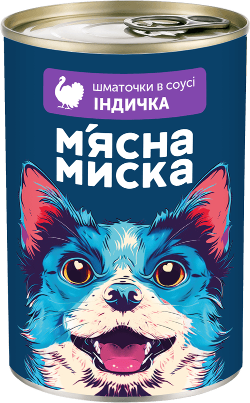 М'ясна миска - щоразу до блиску! М'ясні шматочки з індичкою в соусі від М'ясна миска - це новий стандарт корму економ класу. Консерви для собак М'ясна миска шматочки з індичкою у соусі не є делікатесом. Це повнораціонний вологий корм, який готовий до щоденного та постійного годування вашого песика. Смачний та ароматний соус у складі продукту приваблює тваринку до споживання корму. Високий відсоток вмісту м'ясних інгредієнтів (68%) дозволяє легко конкурувати з їжею, приготовленою в домашніх умовах або «зі столу», але має стабільну промислову якість спеціалізованого petfood заводу. Консерви М'ясна миска для собак випускаються в класичних банках зі спеціального харчового металу, завдяки чому корм може зберігатися до 48 годин, за які ви точно згодуєте його своєму улюбленцю.