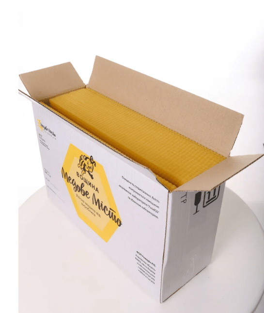 Трутнева вощина виробництва “Медове Місто” під рамку «Дадан » 5 кг. – вощина з пасічного воску на рамку «Дадан» з комірками розміром 6,9±0,05 мм, в упаковках по 1 кілограму, представлена у зручному фасуванні. Відмінною рисою вощини є високий ступінь очищення воскосировини, що використовується, за інноваційною екологічно безпечною технологією без використання хімреактивів. Також цей розмір купують для встановлення на «піврамку», вручну розрізаючи лист навпіл.