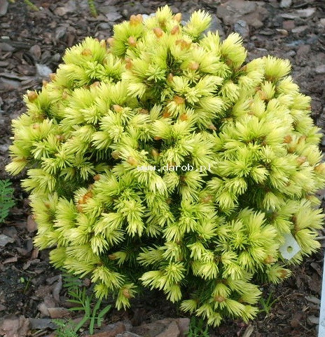 Форма. Дуже низький сорт, який відкрили в Польщі в 2000 році. Головна особливість - це яскрава жовта хвоя, а також крона дуже правильної кулястої форми.