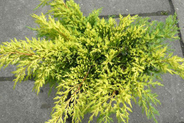 Опис: ялівець Gold Star - середньої висоти з декоративною розкидистою плоскою кроною, жовто-золотистими пагонами, розбігається від центру до периферії гострими промінчиками хвої.