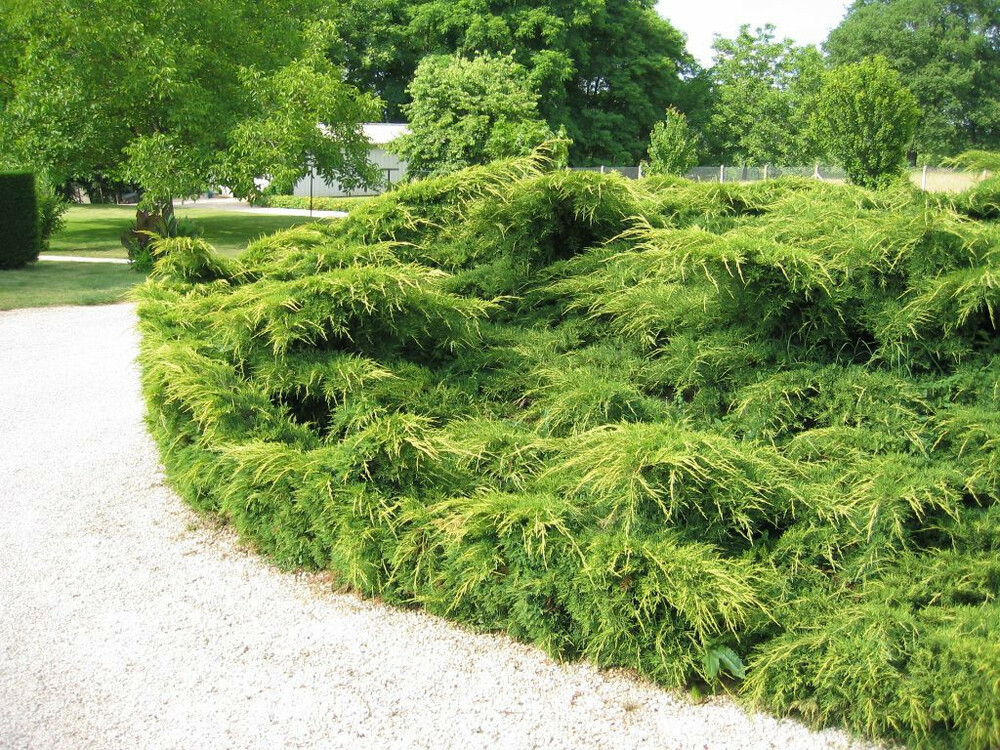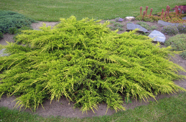 Опис. Жовта мутація ялівцю середнього «Рfitzeriana», форма аналогічна, швидкозростаюча, як і вихідна зелена форма.
