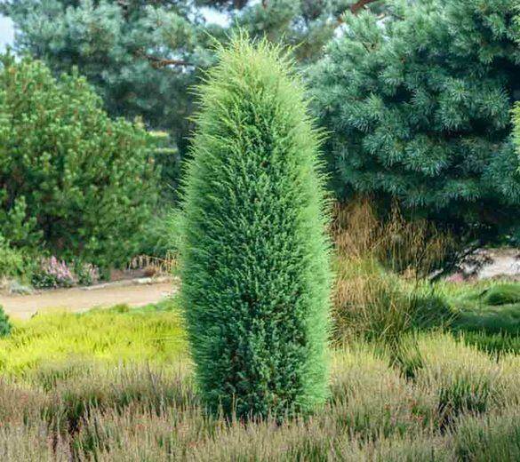 Форма: колоновидний ялівець з вузькою, дуже густо розгалуженою колонновидною кроною, кінці пагонів жорсткі і вертикальні не нахилені.