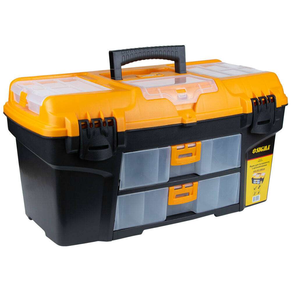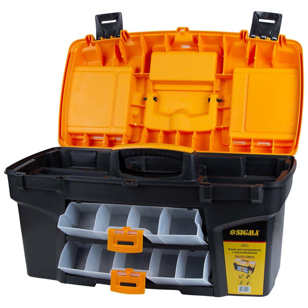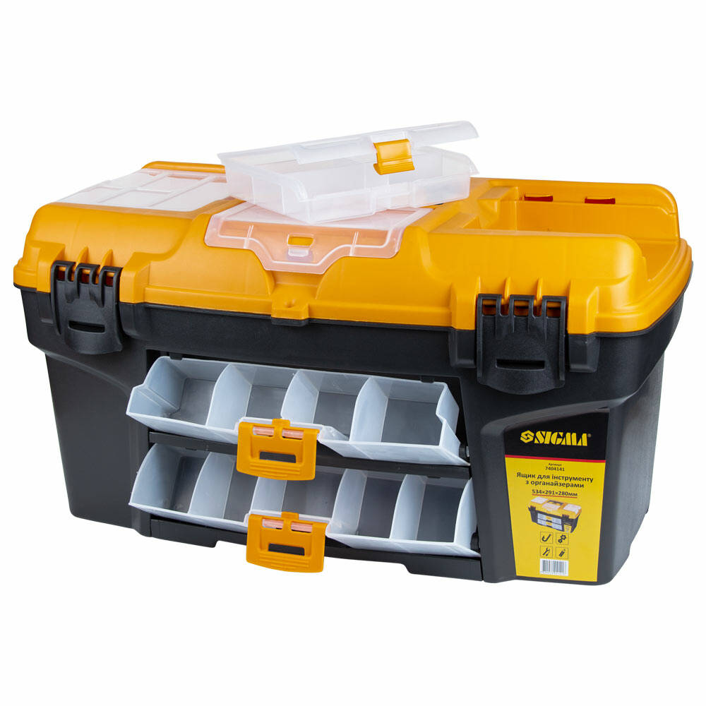 Ящик для інструменту зі знімними органайзерами та консоллю 534×291×280мм SIGMA (7404141) призначений для зберігання, транспортування, перенесення і зручного доступу до ручного інструменту. Допомагає системно організувати зберігання дрібних деталей: кріплення, шайб, гайок та інших дрібниць. Простота в пошуку необхідних деталей забезпечується наявністю декількох секцій. Функціональний і знаходить застосування в багатьох сферах діяльності: перенесення індивідуальних інструментів, комплектація наборів інструментів і дрібних деталей для домашнього майстра, укладання дрібних предметів на відпочинку - риболовлі, полюванні, рукоділлі; при комплектації необхідного набору інструментів і аксесуарів для автомобіля, майстерні, гаража або СТО, і ін.