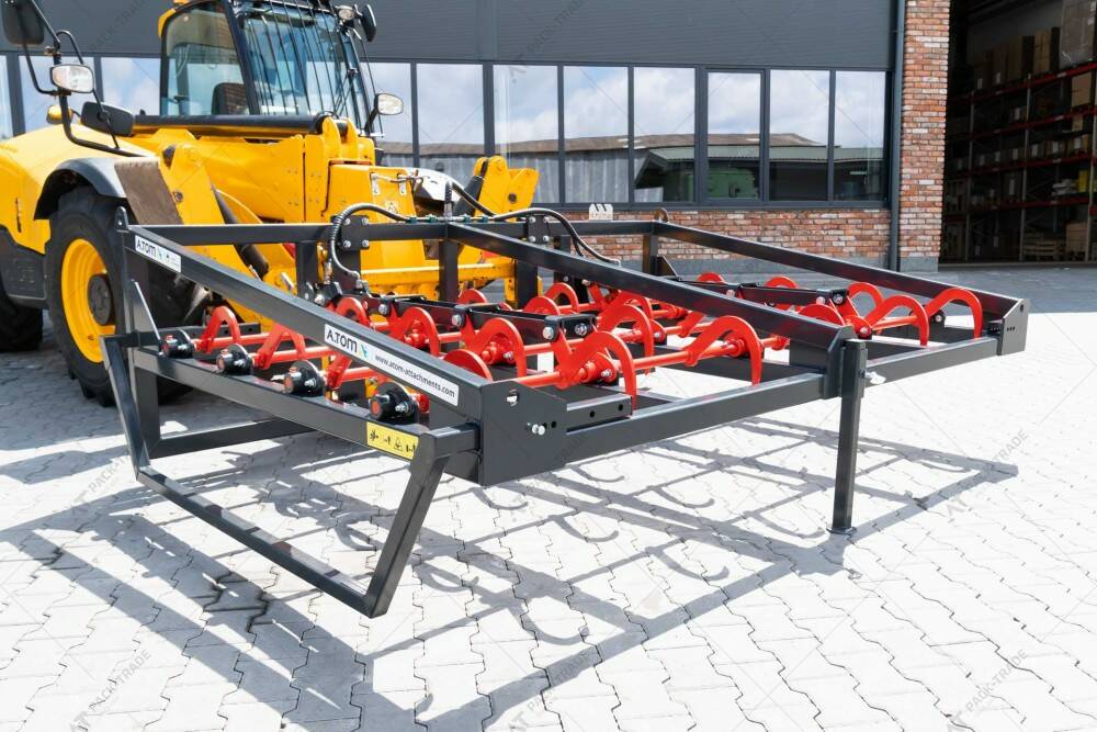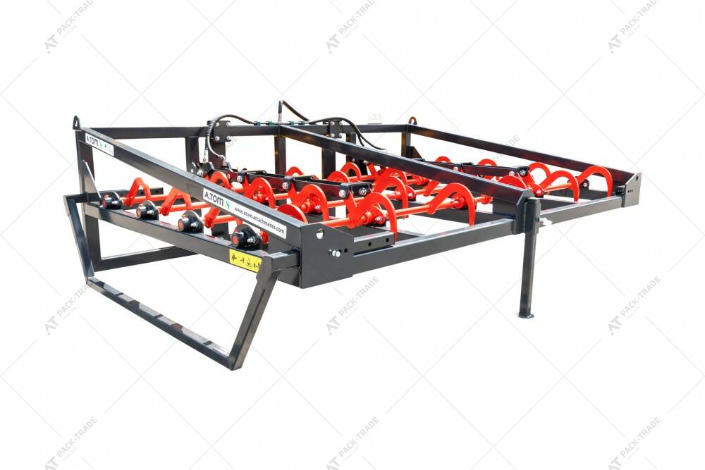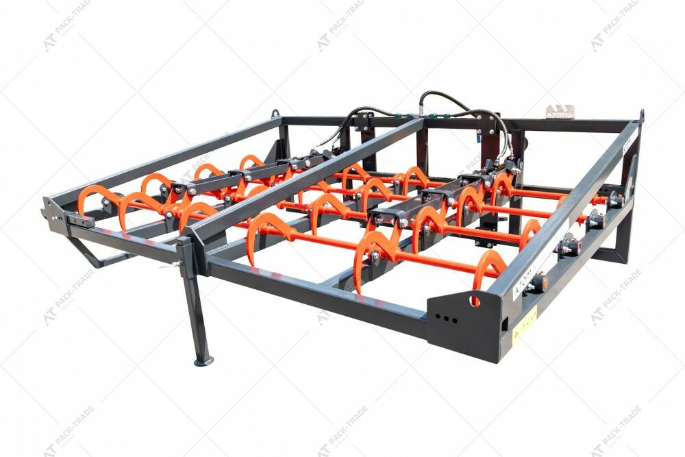 Захват для квадратних тюків (3 тюка) - А.ТОМ B3 H – це оптимізоване рішення від ТМ «А.ТОМ», що дозволяє працювати одночасно з трьома тюками. Ключові особливості квадратних тюків – це доволі велика вага та габаритність, а квадратний захват можна застосовувати для фіксації та переміщення тюків довжиною до 2,5 м та вагою до 600 кг. 24 серпоподібні зубці зі зносостійкої сталі надійно фіксують та не пошкоджують тюк. Захват на три тюки дозволяє щільно складати тюки рівнями, водночас їх не потрібно буде перев’язувати. Ним можна як навантажувати платформу на полі, так і розвантажувати сінаж на критому майданчику. У порівнянні з захватами для одного тюка, таке обладнання значно економить паливо та витратні матеріали, а також дозволяє зменшити кількість виїздів на поле втричі. Поєднання продуманої та надійної конструкції з двома потужними гідроциліндрами спрощує процес збору тюків та значно прискорює його. Повністю сумісний з телескопічними навантажувачами.