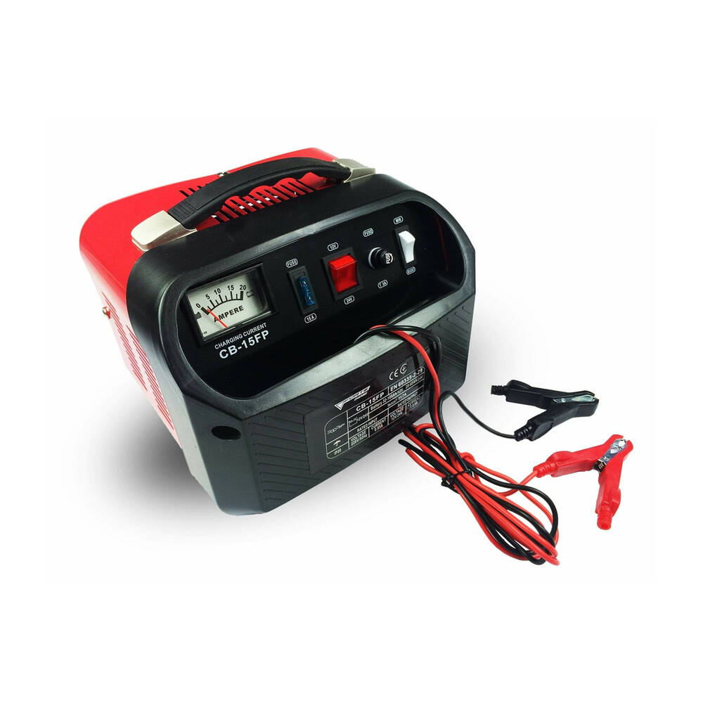 Опис Forte CB-15FP Зарядний пристрій FORTE CB-15FP - зарядний пристрій відноситься до обладнання побутового сегмента, зі ступенем захисту IP23 і класом ізоляції H. Його живлення здійснюється від побутової електричної мережі 220 вольт. Зовні пристрій виконаний у вигляді класичного електричного приладу з металевому корпусом. Робоча панель має красиву обтічну форму. На ній розташовані амперметр, перемикач вихідної напруги, регулятор плавного настроювання сили струму і вмикач харчування. На інших панелях розташовані вентиляційні канали для повітряного охолодження внутрішніх компонентів приладу. Крім цього, на верхній панелі знаходиться зручна транспортувальна ручка, виготовлена ​​з пластику, а на задній панелі знаходяться вхідний і вихідні електричні кабелі. FORTE CB-15FP виробляє вихідну напругу 12 і 24 вольта. Максимальна ємність акумуляторів, що заряджаються становить 135 ампер-годин, а мінімальна - 25. Гранична сила струму зарядки дорівнює 7 ампер. Споживана приладом потужність становить 110 ват. Як видно, за допомогою цього зарядника можна працювати з досить великою кількістю різновидів перезаряджаються батарей, що мають різну ємність. Для забезпечення безпечної роботи передбачені захист від перенапруги і некоректного підключення. У сукупності з високими технічними характеристиками FORTE CB-15FP має невелику вагу і розміри. Габарити пристрою становлять 300х210х185 мм, а вага - 5 кг. Поставляється прилад в красиво оформленій картонній коробці. Також додається інструкція користувача. Особливості: Однофазное портативний зарядний пристрій для акумуляторів напругою 12 / 24В Ступінь захисту IP23 Захист від перенапруги і неправильного підключення Можливість використовувати в складних умовах