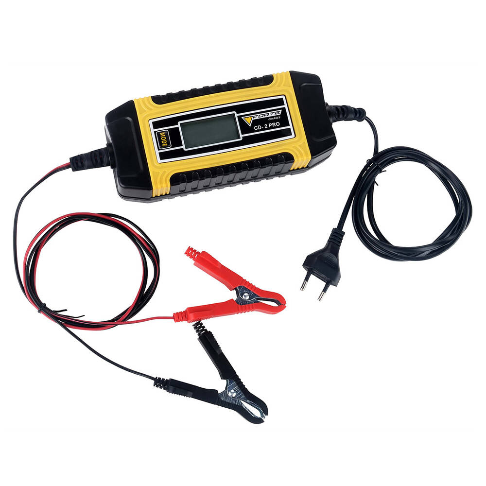 Зарядний пристрій для акумулятора CD-2 PRO Forte Зарядний пристрій Forte CD-2 PRO, 220 В, зарядний струм 2А, для акумуляторів 6/12 В ємністю до 120 Аг, вага 0.38 кг Підходить до всіх видів акумуляторів Одинадцять ступенів зарядки Ущільнююче кільце для мотоциклів, вантажних автомобілів, кабріолетів Зимовий режим при низьких температурах