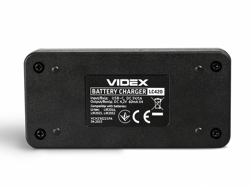 Зарядний пристрій Videx VCH-LC420 — це компактний і ефективний зарядний пристрій для літій-іонних кнопкових акумуляторів типу LIR2016, LIR2025, LIR2032. Він оснащений чотирма незалежними гніздами для зарядки і автоматично визначає струм заряду, що забезпечує зручність у використанні. Цей пристрій також має LED індикацію, яка сигналізує про процес зарядки і готовність до роботи.