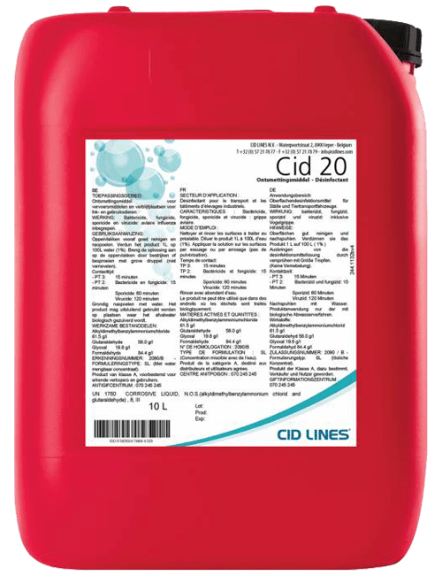 CID 20 - високоефективний дезінфікуючий засіб з полікомпонентною формулою, який має високу ступінь піноутворення. Підходити для короткострокового знезараження будь-яких видів поверхонь. Завдяки детально розробленій рецептурі засіб має потужний протидіючий ефект до будь-яких видів хвороботворних мікроорганізмів (бактерії, спори, грибки, віруси). CID 20 характеризується стабільністю в роботі, економічністю, безпекою у виробництві, не завдає шкоди оброблюваним поверхням. Робочий розчин має нейтральний pH, неагресивний, ефективний навіть при низьких концентраціях. Засіб не захисту викликання. Показаний до застосування проти ящуру, вірусу класичної чуми свиней.