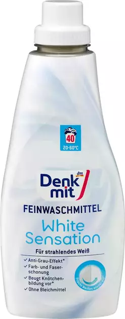 Рідкий порошок для стирання білого білизни. Концентрат. Відмінно відмиває білизну навіть за 20С. Нежна формула догляду, що зберігає при кожному пранні білизну вашого одягу, так що ваш одяг виглядає новим набагато довше. Також підходить для шовку. Рідкий пральний порошок Denkmit захищає волокна тканини від пошкоджень під час прання, використовується для прання білого білизни, захищає деталі стиральної машини від накипу. Підходити як для ручної, так і для машинної прання.