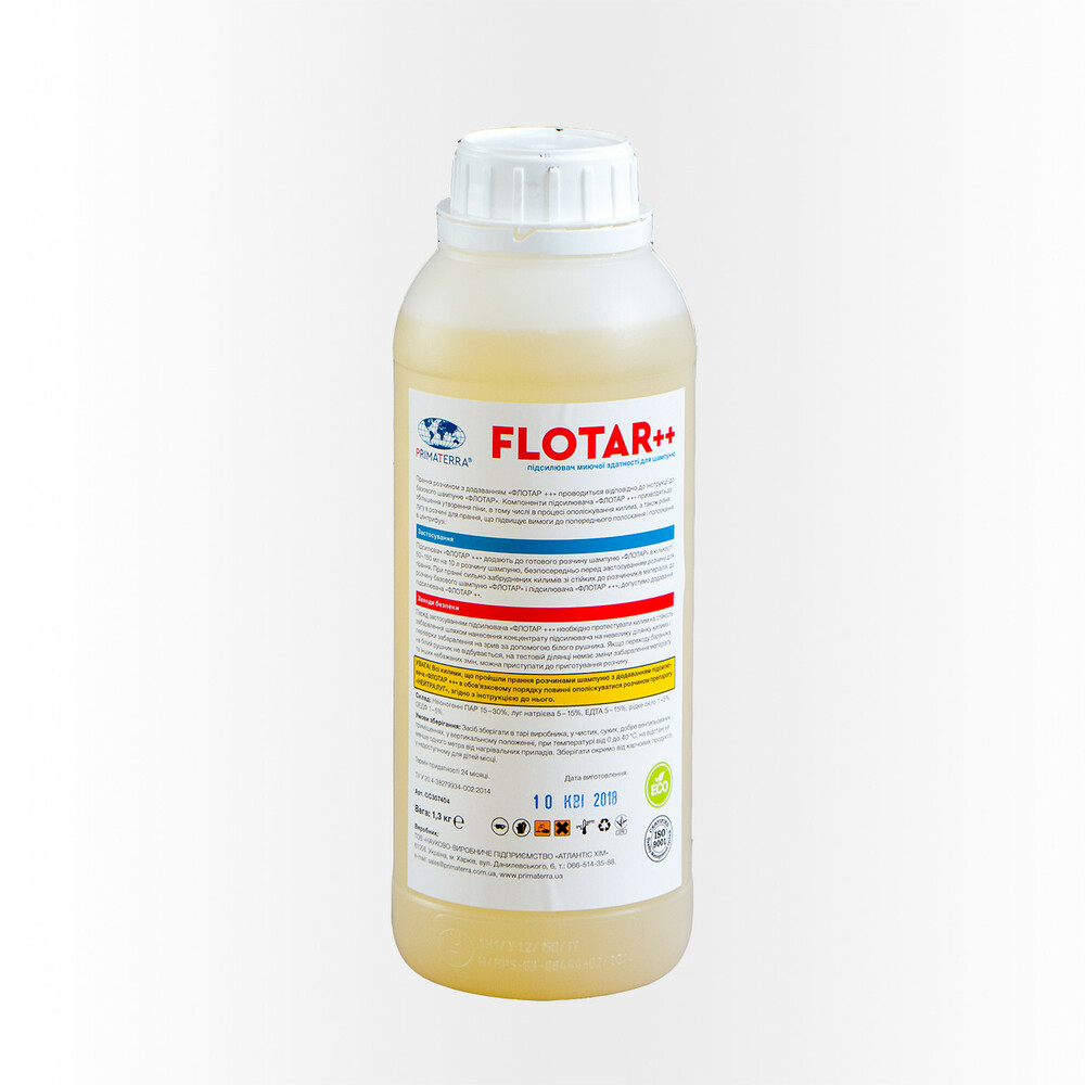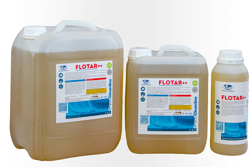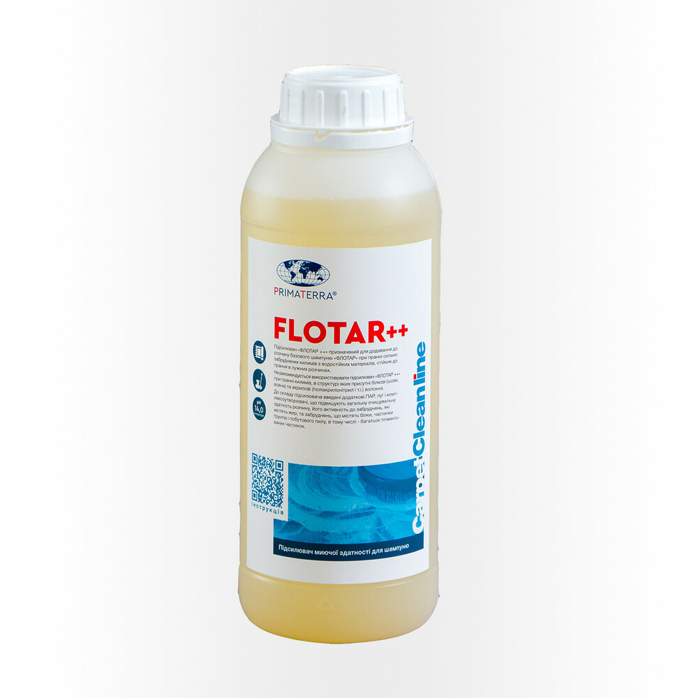 Flotar++ жорсткий підсилювач для прання килимів призначений для додавання до розчину базового шампуню «ФЛОТАР» при пранні дуже забруднених килимів із водостійких матеріалів, стійких до прання у лужних розчинах. Не рекомендується використовувати підсилювач «ФЛОТАР++» при пранні килимів, у структурі яких присутні білкові (шовк, шерсть) та акрилові (поліакрилонітрил тощо) волокна. Застосування: підсилювач «ФЛОТАР++» додають готовий розчин шампуню «ФЛОТАР» в кількості 50-150 мл на 10 літрів розчину шампуню, безпосередньо перед застосуванням прального розчину. Склад: Вода демінералізована, гідроксид натрію, 5-15% неіногенні ПАР, ЕДТА, реосорбент.