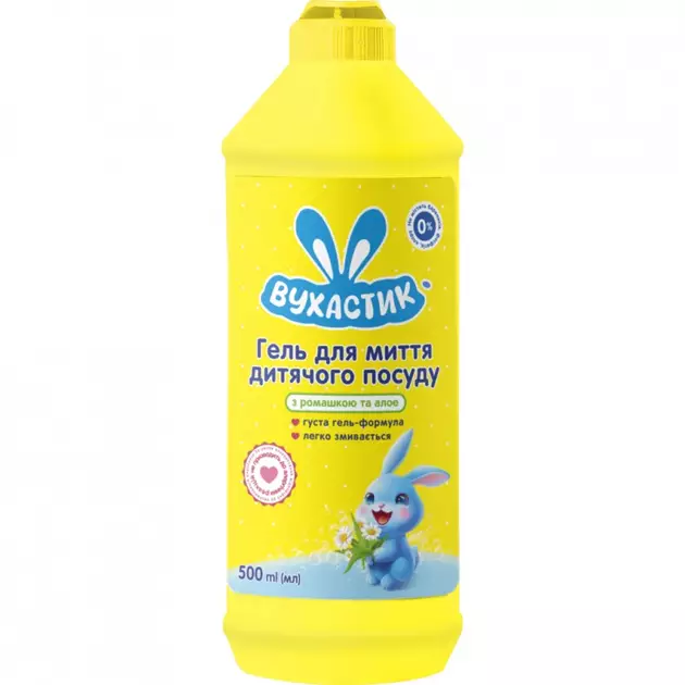 Гель "Вухастик" создан специально для мытья детской посуды, бутылочек из стекла и пластика, сосок из латекса и силикона, игрушек и т.д. Мягкая формула эффективно удаляет различные загрязнения на любых поверхностях, с которыми соприкасается ребенок с первых дней жизни. Самое главное - средство не содержит мыла, красителей, фосфатов и хлора.