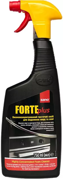 Sano Forte Plus — концентрований високоефективний засіб для видалення жиру, сажі та кіптяви. З легкістю видаляє найважчий бруд, що глибоко в'ївся, і обгорілий жир із духовок, дек, гриля, каструль, казанів, сковорідок, решіток, витяжок, кухонних робочих поверхонь та інше.