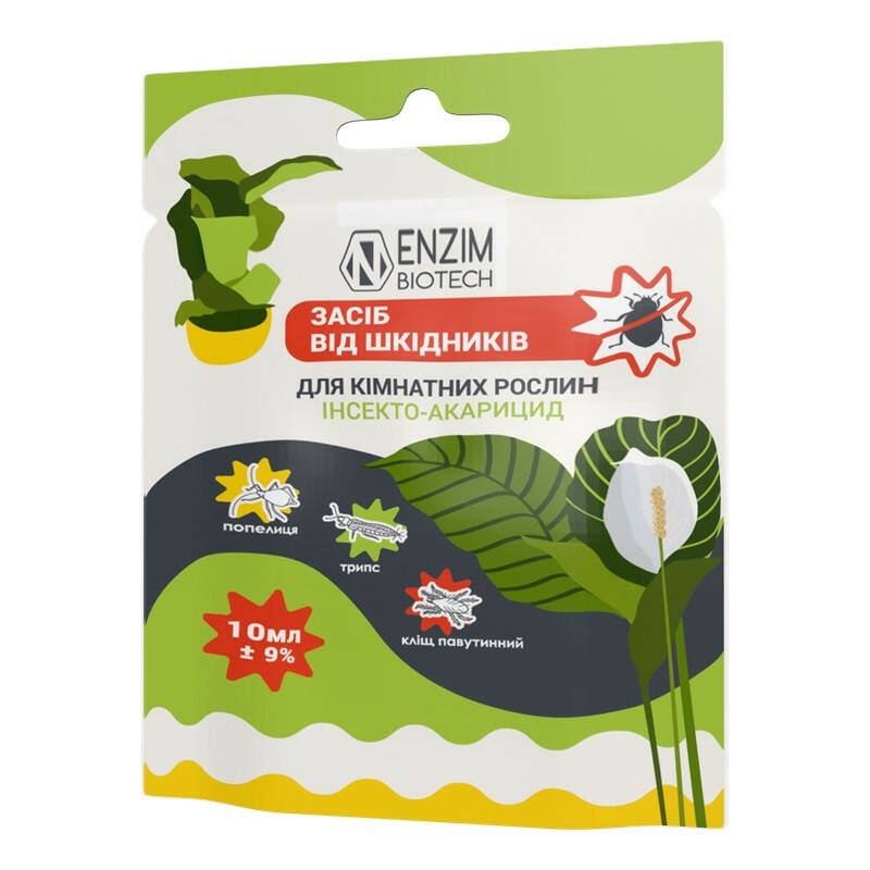 Засіб від шкідників для кімнатних рослин від Ензим Агро – інсекто-акарицид призначений для профілактики появи і захисту кімнатних рослин від найпоширеніших шкідників: попелиця, павутинний кліщ, білокрилка, борошнистий червець, трипс та ін. Спеціально розроблена нова формула препарату, яка не має неприємного запаху - дозволяє використовувати його у житлових приміщеннях.