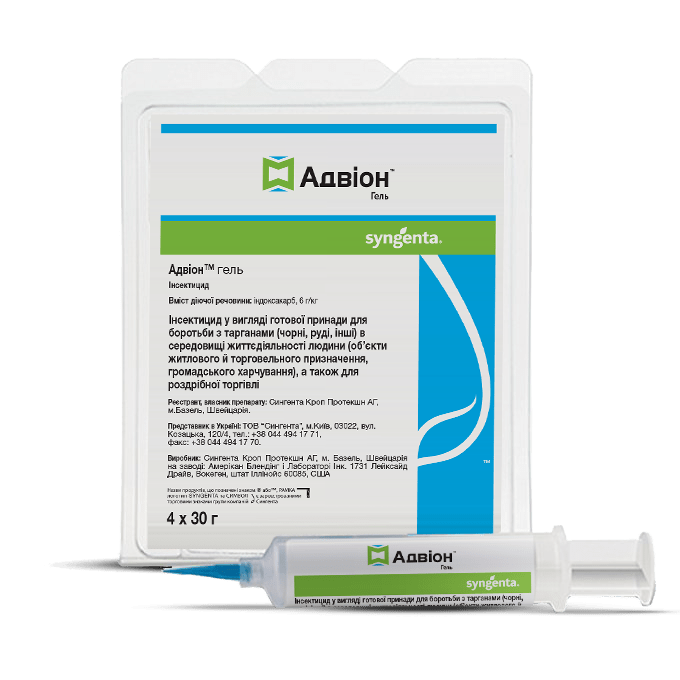 Адвіон гель– високоефективна приманка, спрямована на боротьбу з усіма видами тарганів, зокрема з прусаками. Унікальний механізм дії препарату ефективно впливає лише на цільові організми. Висока смакова привабливість і революційна діюча речовина забезпечують швидке знищення популяцій тарганів.