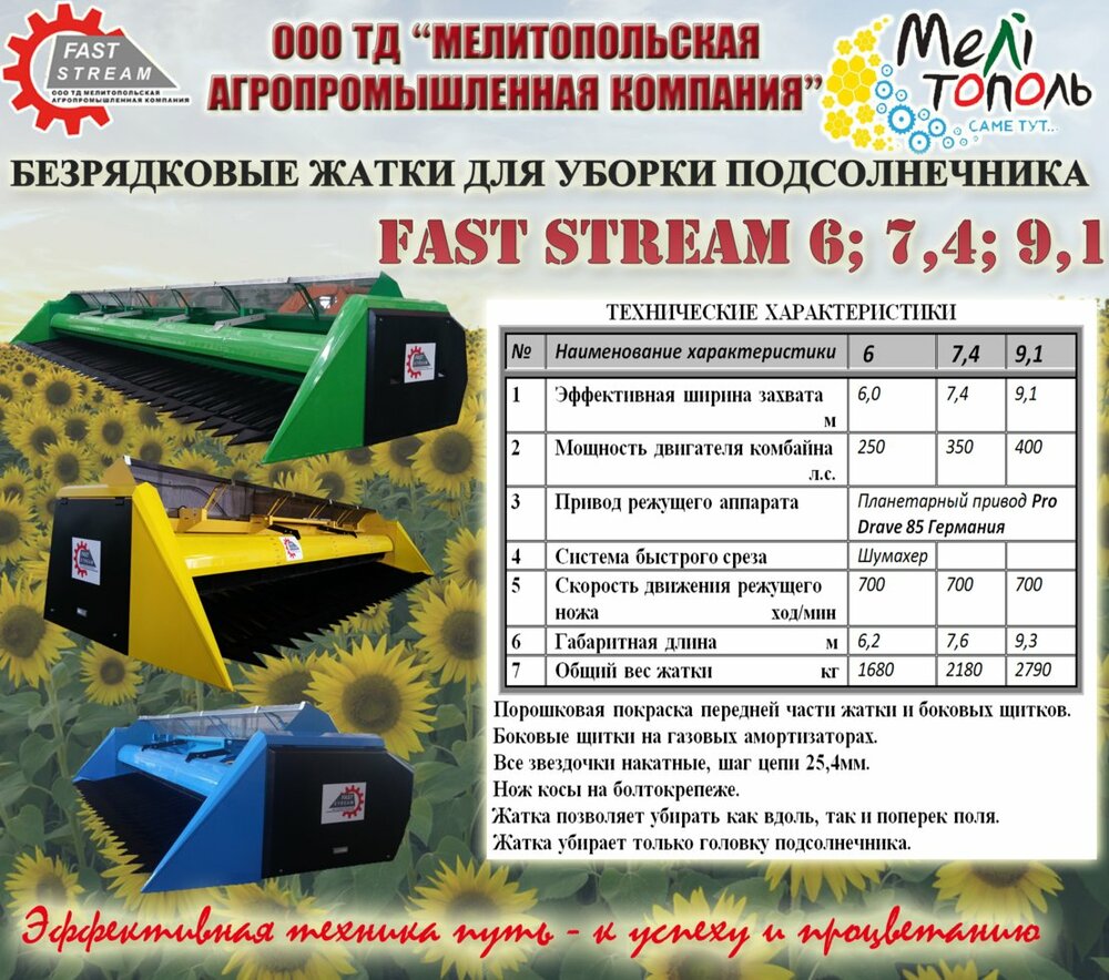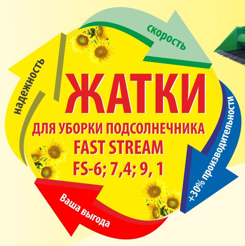 Жатка для уборки подсолнечника «Fast Stream» в исполнении 7,4 м - это модернизированный и апробированный к условиям СНГ аналог итальянской жатки «Zaffrani».