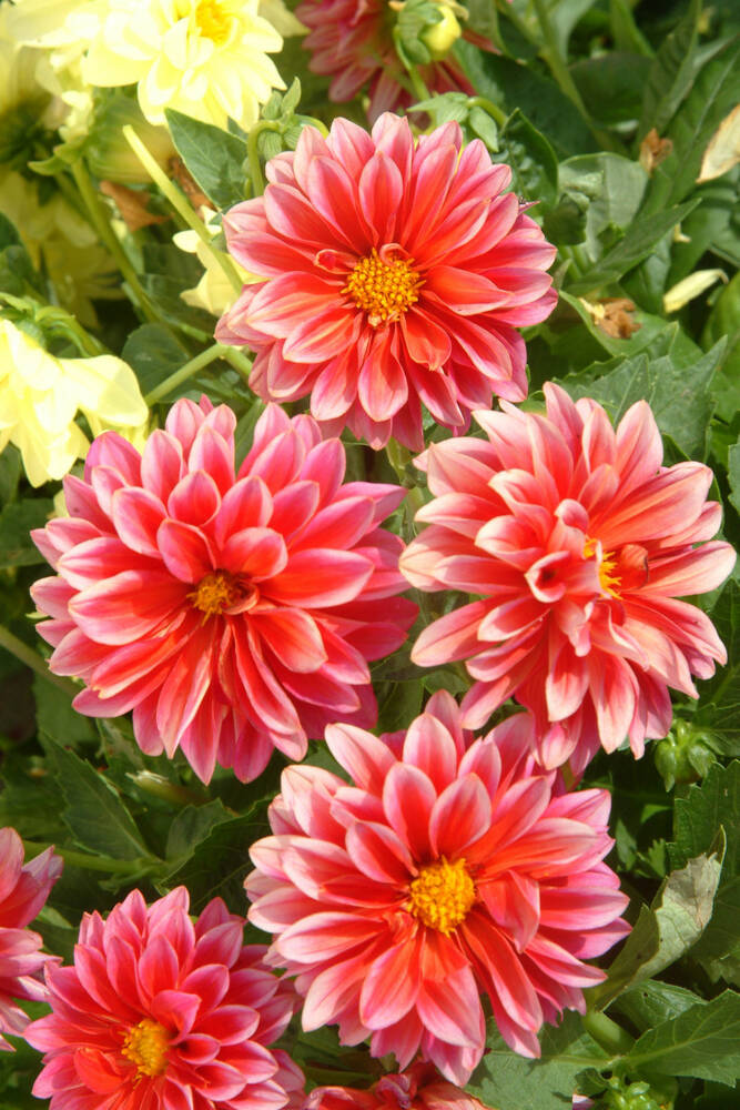 Жоржина Червоний дим – однорічна, середньоросла жоржина. Висота до 35 см, з бронзово-червоним листям і великою кількістю напівмахрових суцвіть діаметром до 10 см, помаранчевого, червоного кольорів. Щоб отримати ранні квіти, насіння висівають у лютому - квітні в парники, а у відкритий грунт - у травні. Місце виділяють сонячне, захищене від вітру, з гарною циркуляцією повітря. Цвітіння - рясне, з липня до заморозків. Рослина теплолюбна. Слід уникати низьких, заболочених ділянок. Грунти любить глибоко оброблені, родючі, добре дреновані, пухкі, з додаванням вапна. Вирощують при постійних поливах і підгодівлі. Ідеально підходить для посадок в контейнери, для оформлення бордюрів, строкатих квітників. Гармонійні посадки окремими групами і в суміші серед низькорослих квітів.